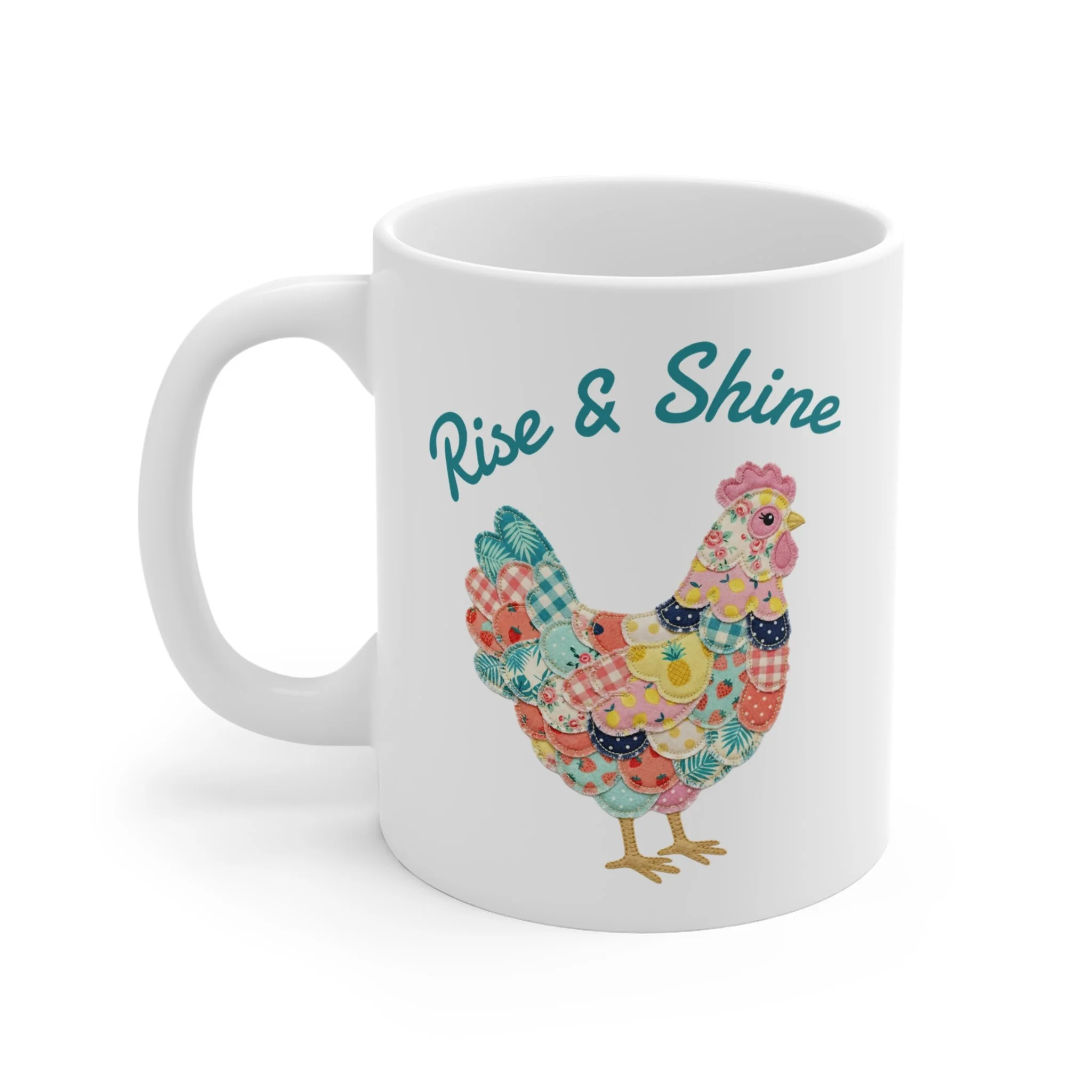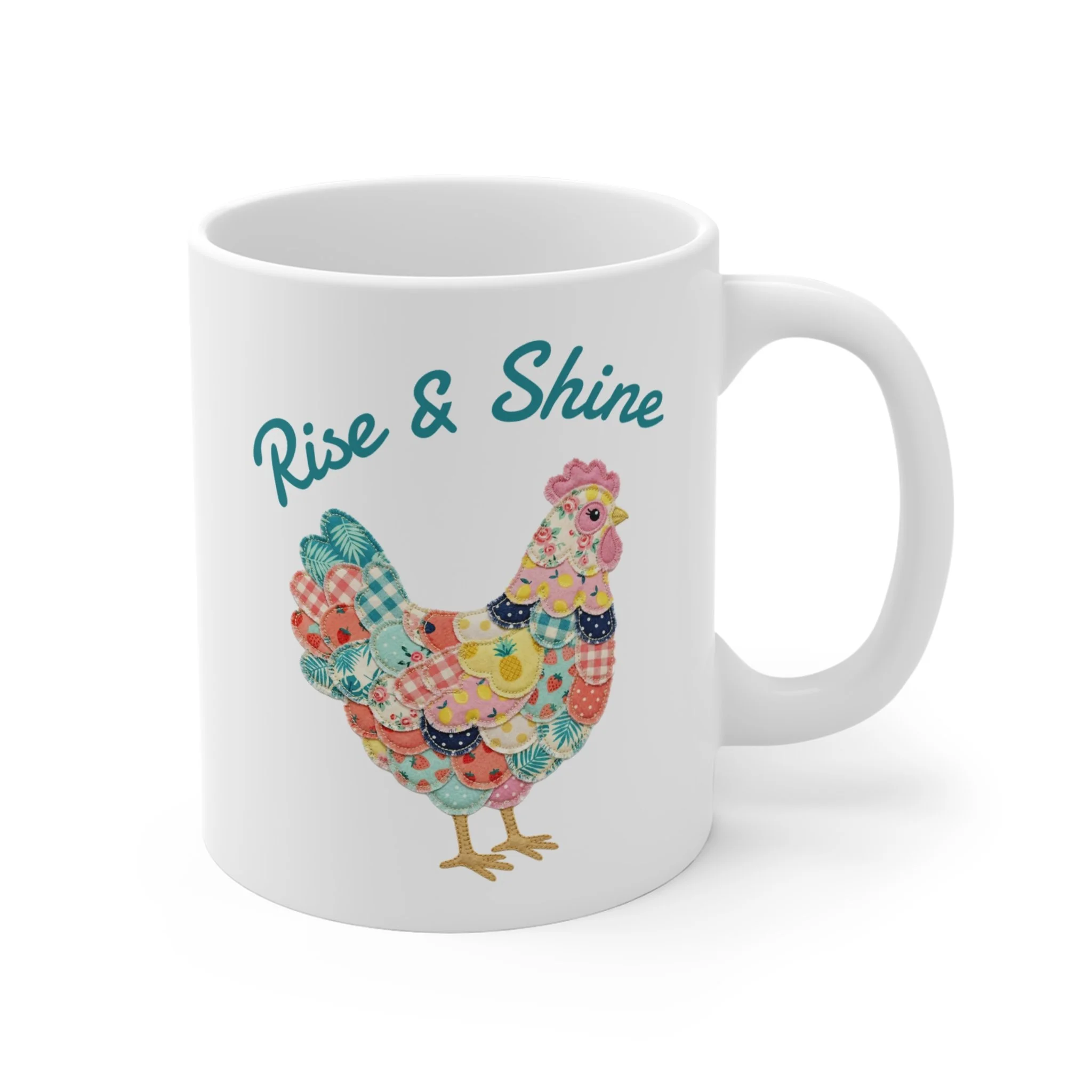 | Warm mornings, colorful clucks. This 11oz ceramic mug carries a patchwork hen in cheerful florals and soft pastels, crowned with the hand-lettered message “Rise & Shine.” It feels like a sunlit kitchen window: bright, cozy, and gently optimistic. Hold it when you’re easing into the day with a slow brew, or hand it across the table to someone who savors simple, homey moments. The artwork sits crisp on a clean white canvas, bringing farmhouse charm without feeling fussy. It’s the kind of mug that turns a routine coffee into a small, happy ritual. |